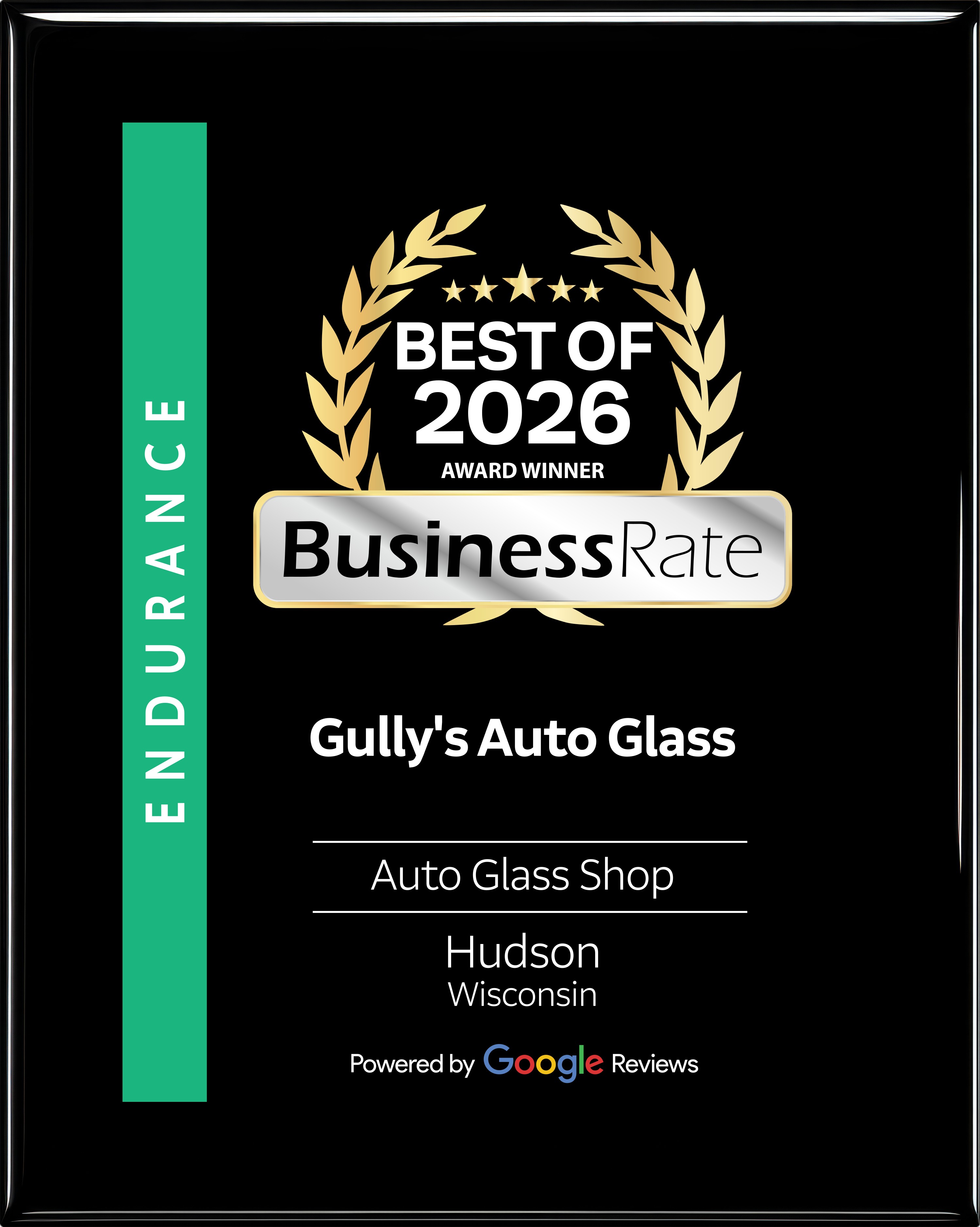 Gully's Auto Glass has officially been recognized as the Hudson, Wisconsin Award Winner in the Auto Glass Shop Category - an honor based on verified data from Google Reviews, as analyzed and certified by BusinessRate.